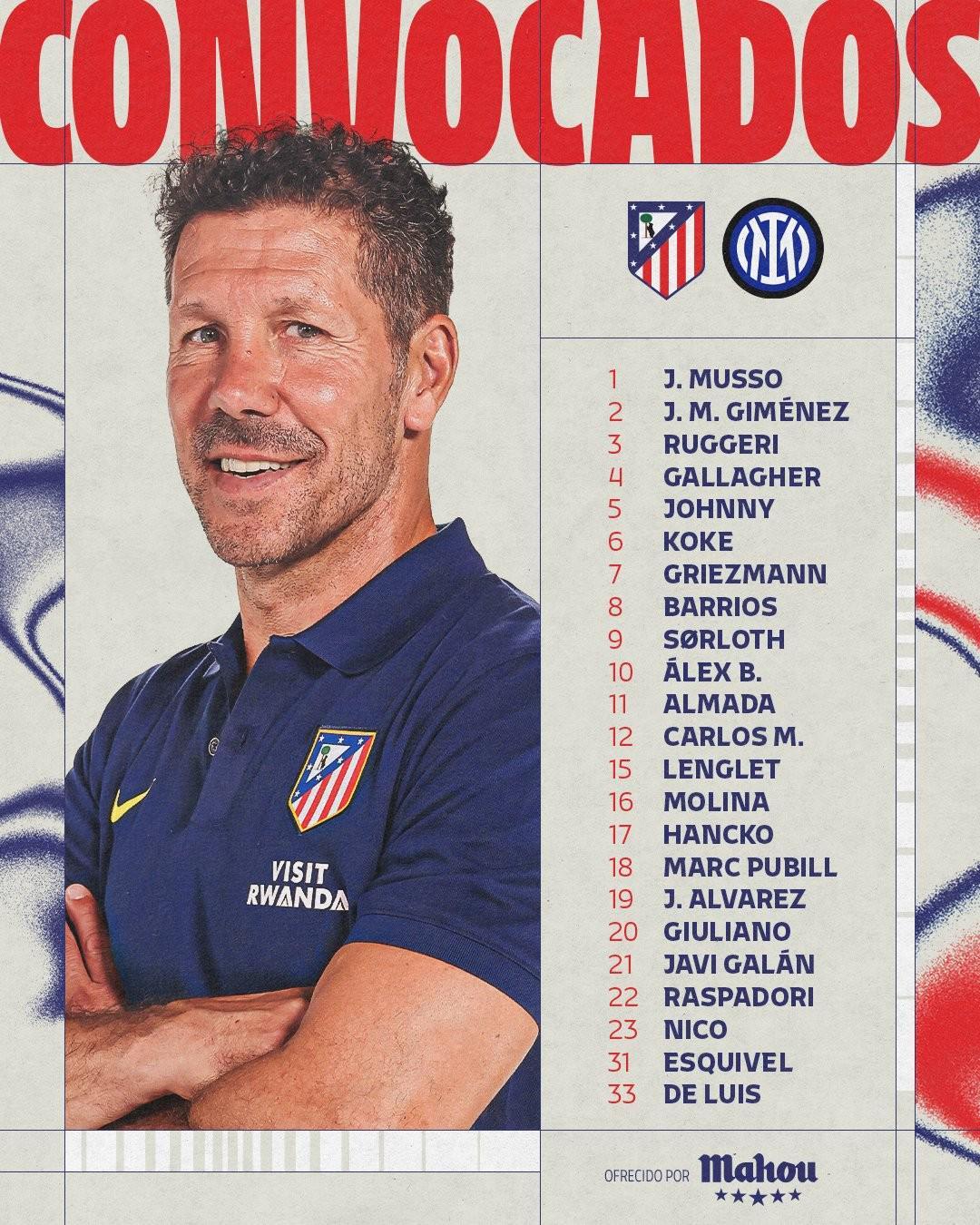 北京时间11月26日,马德里竞技公布了欧冠联赛阶段第5轮他们主场迎战国际米兰的大名单,格列兹曼、胡利安-阿尔瓦雷斯领衔,朱利亚诺-西蒙尼归队,不过奥布拉克、勒诺尔芒、马科斯-略伦特因伤缺阵。