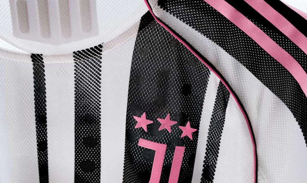 阿迪达斯标志、俱乐部徽章及肩部三条纹均以亮眼桃粉点缀,遥溯俱乐部建队之初对粉色的钟爱与传承,铭记斑马军团的独特底蕴。
