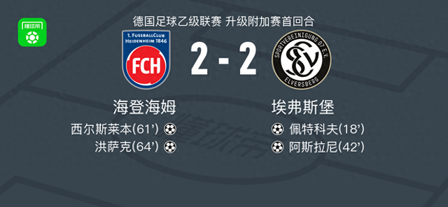 北京时间5月23日,德国足球乙级联赛升级附加赛首回合,海登海姆主场迎战埃弗斯堡。比赛中,埃弗斯堡由佩特科夫率先建功,助攻者是阿斯拉尼;随后阿斯拉尼亲自完成破门,为球队扩大优势。海登海姆在落后情况下发起反击,西尔斯莱本与洪萨克相继取得进球,将比分扳平。最终,双方以2-2的比分结束本场比赛。