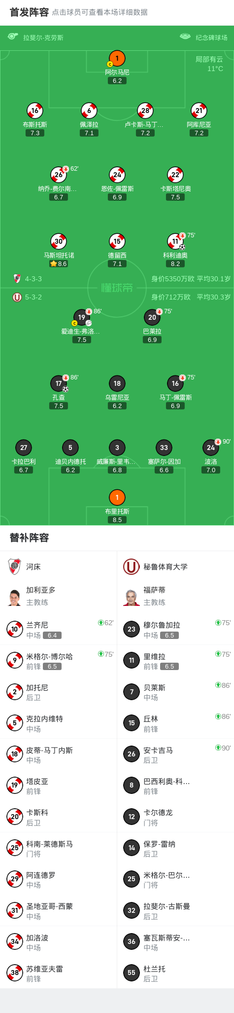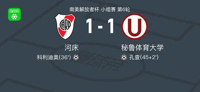 南美解放者杯小组赛第6轮,河床与秘鲁体育大学 较量。比赛中,河床由科利迪奥打入一球,为球队取得领先。随后,秘鲁体育大学凭借孔查的进球扳平比分。最终,双方以1-1的比分结束比赛。