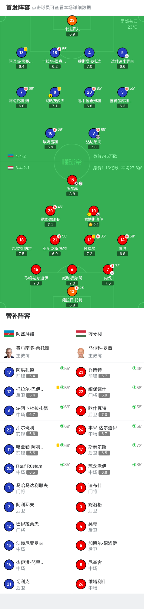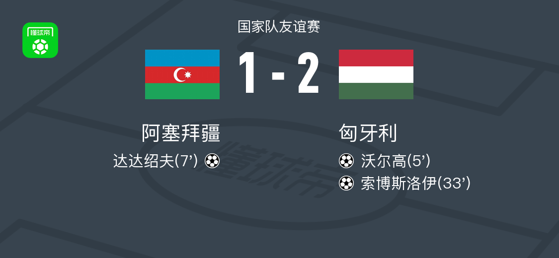 北京时间6月11日国家队友谊赛,阿塞拜疆对阵匈牙利。阿塞拜疆达达绍夫破门。匈牙利沃尔高破门,索博斯洛伊破门。最终比分阿塞拜疆 1 - 2 匈牙利。