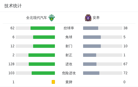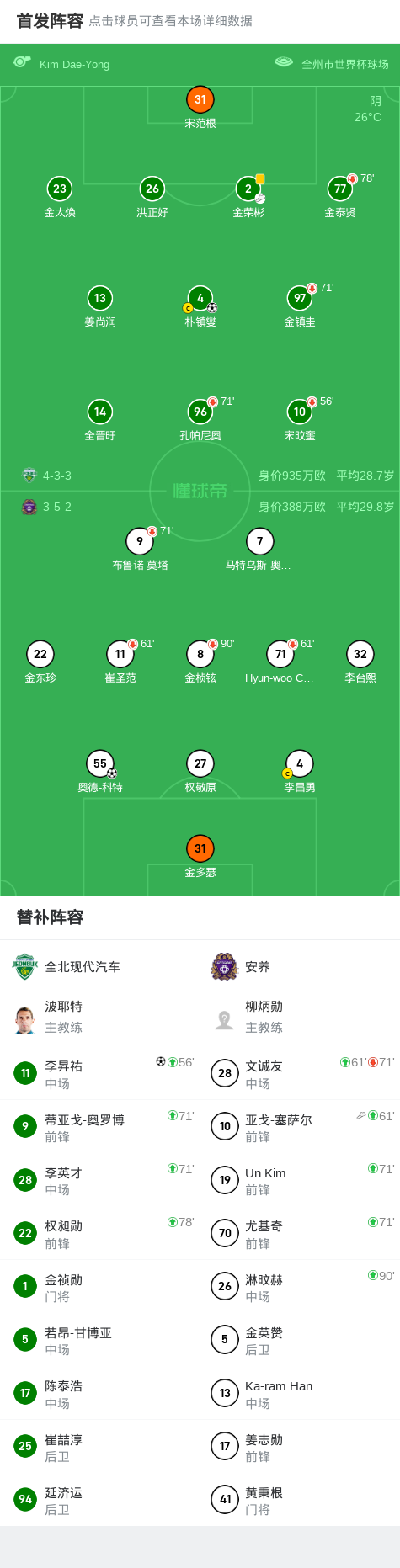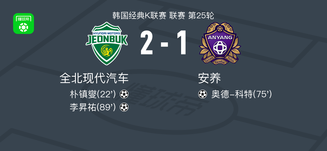 北京时间8月8日,韩国经典K联赛第25轮,全北现代汽车坐镇主场迎战安养。比赛中,全北现代汽车由朴镇燮接金荣彬助攻首开纪录,随后安养由奥德-科特接亚戈-塞萨尔传球扳平比分。比赛尾声阶段,全北现代汽车由李昇祐再入一球锁定胜局。最终全北现代汽车以2比1战胜安养。