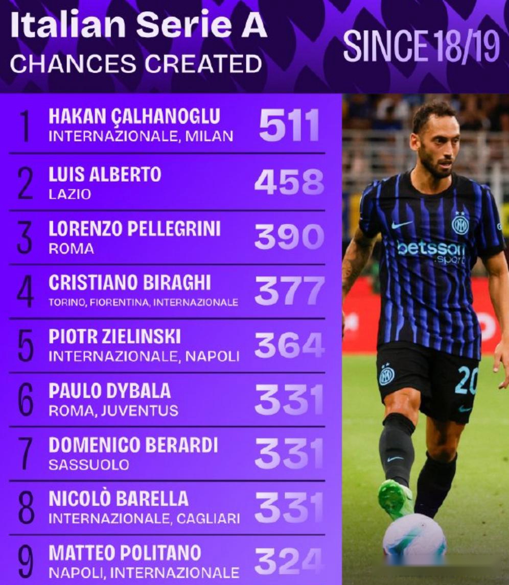 泽林斯基不同,无论在那不勒斯,还是在国米,他都不是定位球主罚者(这7年来,泽林斯基合计主罚角球、任意球还不到70次,一年轮不到10次),即便如此,他仍能7年送出364次关键传球,喂球能力,绝对是意甲顶级。
