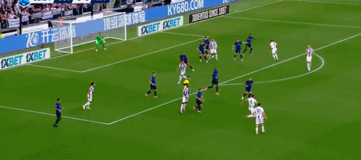 第14分钟,后卫连线,布雷默将球传向中路,凯利破门,尤文1-0国米