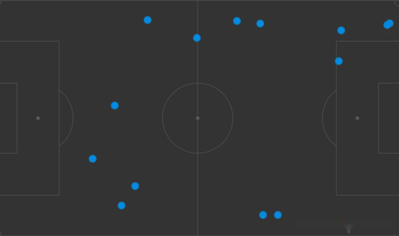 国米这15次成功铲断的具体分布,如图所示,基本上都是在边路。