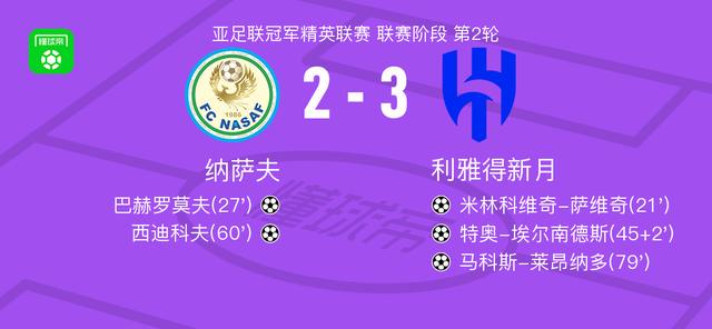 北京时间9月29日亚足联冠军精英联赛 联赛阶段 第2轮,纳萨夫对阵利雅得新月。纳萨夫巴赫罗莫夫破门,西迪科夫破门。利雅得新月米林科维奇-萨维奇破门,特奥-埃尔南德斯破门,马科斯-莱昂纳多破门。最终比分纳萨夫 2 - 3 利雅得新月。
