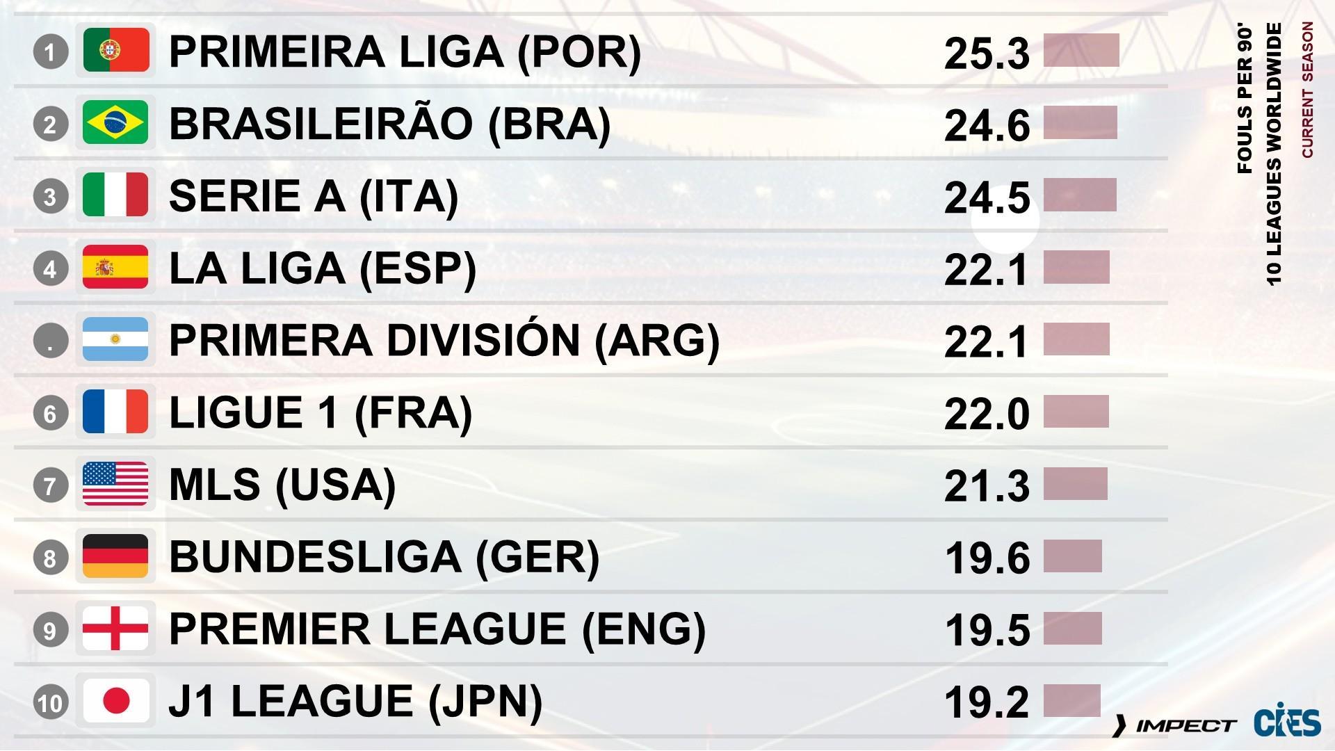 当地时间10月13日,瑞士足球天文台统计了各国联赛每90分钟的犯规情况,其中葡超以25.3次犯规位居榜首,巴甲以24.6次位列第二,意甲以24.5次位列第三。