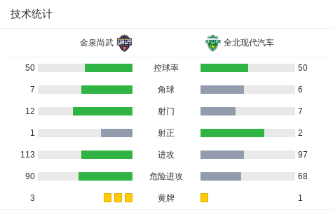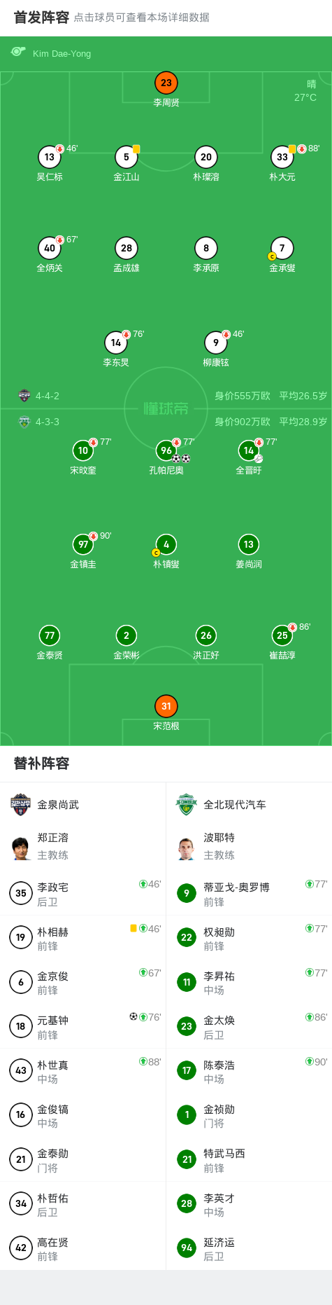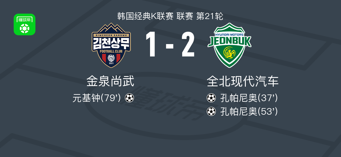 北京时间6月27日韩国K联赛第21轮,金泉尚武主场迎战全北现代汽车。比赛中,全北现代汽车球员孔帕尼奥在第37分钟接队友全晋旴助攻首开纪录,随后于第53分钟再入一球完成梅开二度。金泉尚武方面,元基钟在第79分钟为球队扳回一城。最终全北现代汽车以2比1战胜金泉尚武。