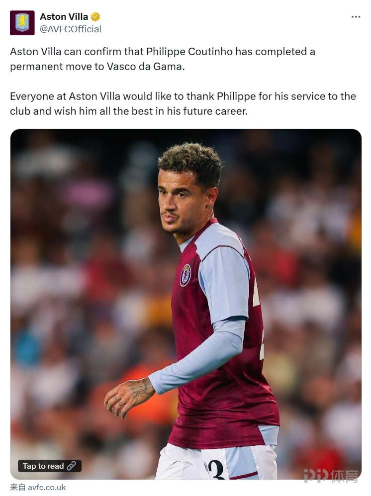 阿斯顿维拉在此确认,菲利佩-库蒂尼奥已经正式永久转会至瓦斯科达伽马俱乐部。