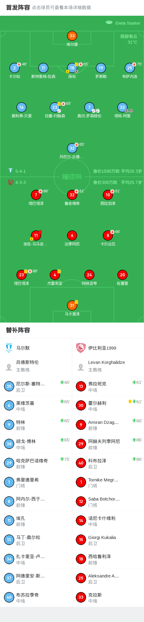 第62分钟,伊比利亚1999球队吉佐-马马吉什维利吃到红牌。