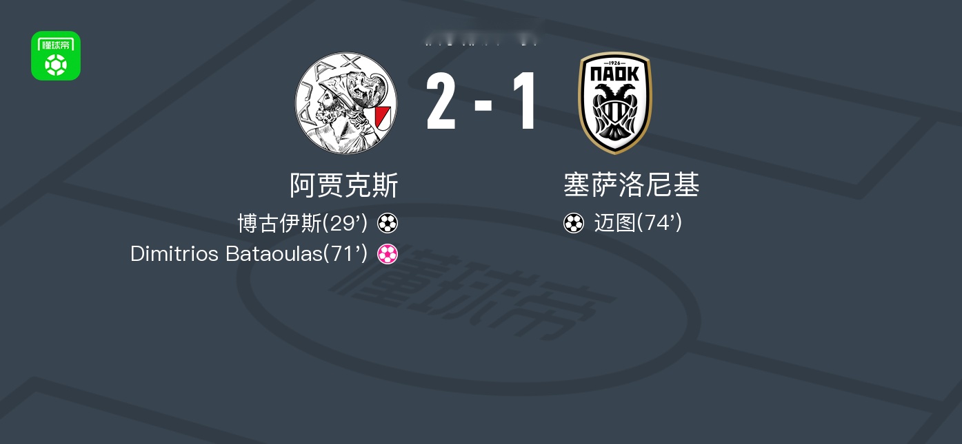 北京时间7月16日进行的一场俱乐部友谊赛中,阿贾克斯与塞萨洛尼基 较量。比赛中,阿贾克斯球员博古伊斯接队友菲慈佔-天乐助攻率先破门。下半场,塞萨洛尼基球员Dimitrios Bataoulas不慎自摆乌龙,随后该队球员迈图由mahamadou balde助攻扳回一城。最终,阿贾克斯以2比1战胜塞萨洛尼基。
