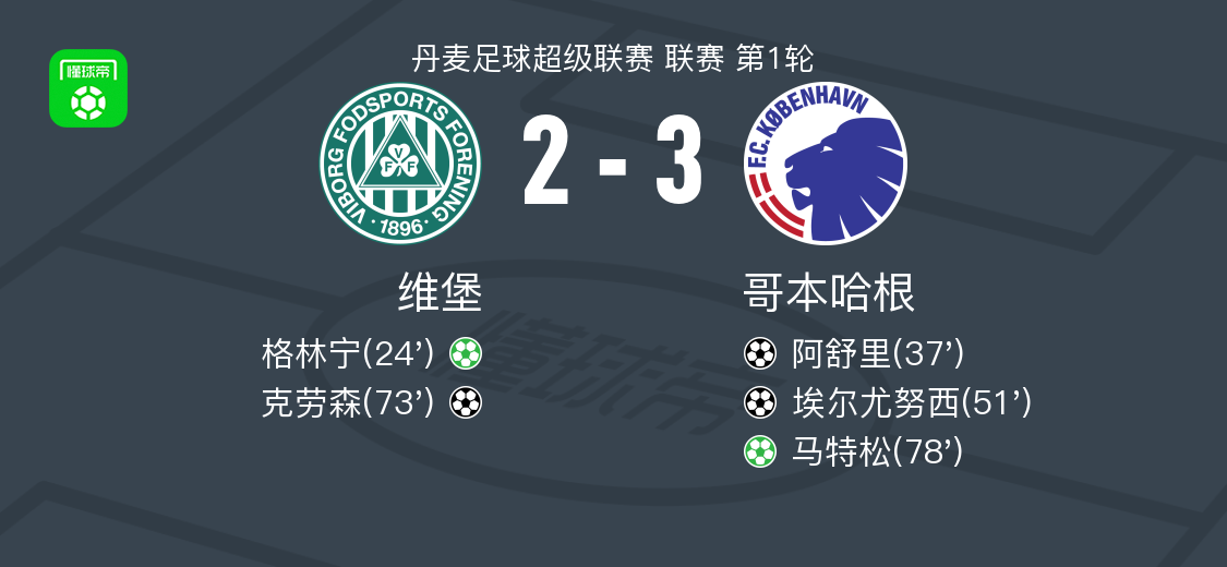 北京时间7月19日,丹麦足球超级联赛第1轮,维堡主场迎战哥本哈根。比赛中,维堡球员格林宁主罚点球命中,随后格林宁又送出助攻,帮助克劳森破门得分。哥本哈根方面,阿舒里成功攻入一球,随后埃尔尤努西接罗德里戈-韦斯卡斯助攻也取得进球,马特松则在下半场罚入点球。最终,维堡以2-3不敌哥本哈根。