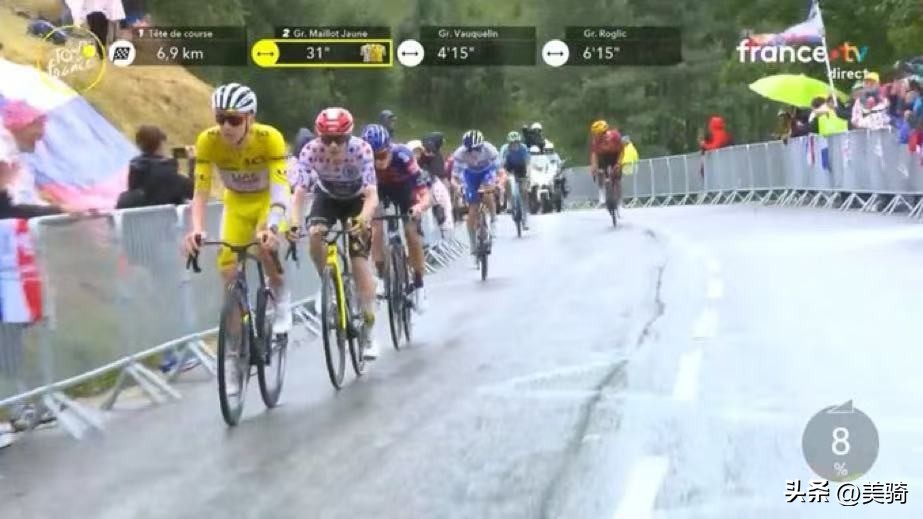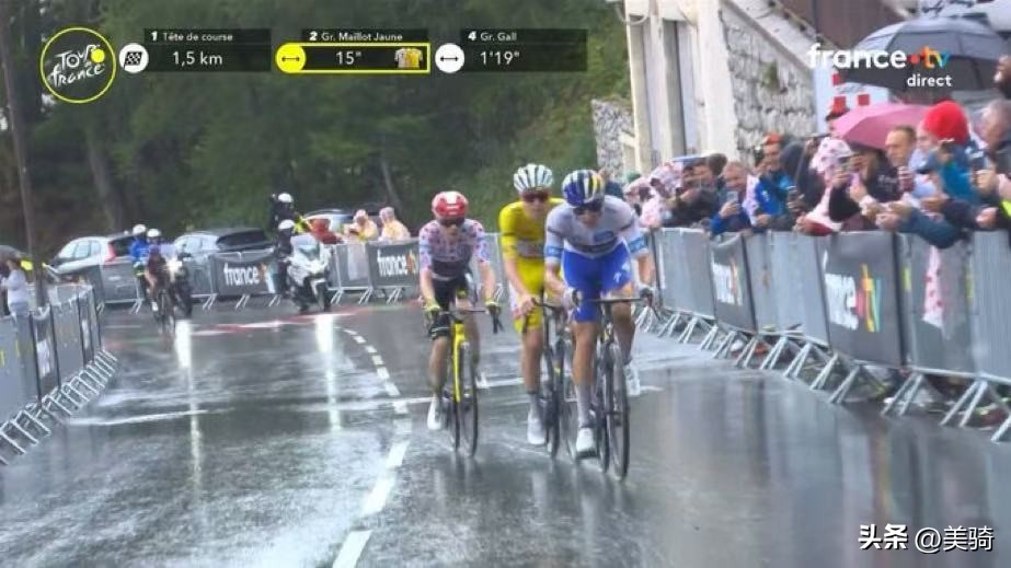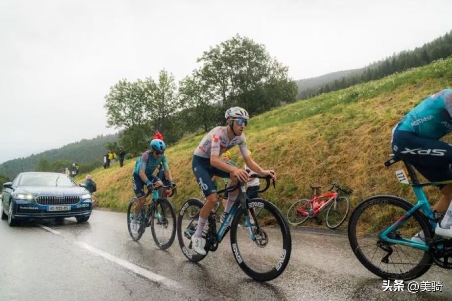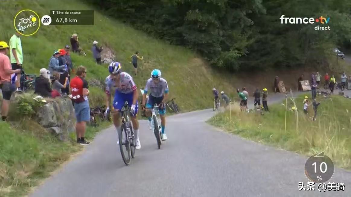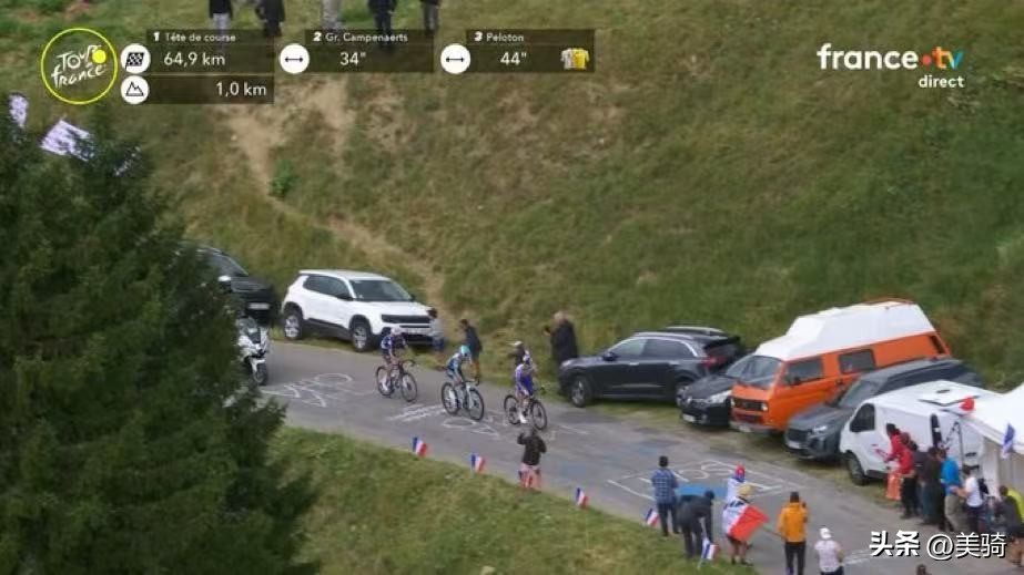 紧接着便是第二个爬坡,最前方的是罗格里奇、马丁内斯以及帕雷潘特,后方则是坎佩纳尔茨等人组成的追击集团,在后方则是大集团。同样的,马丁内斯也是拿下了这个二级坡的积分。