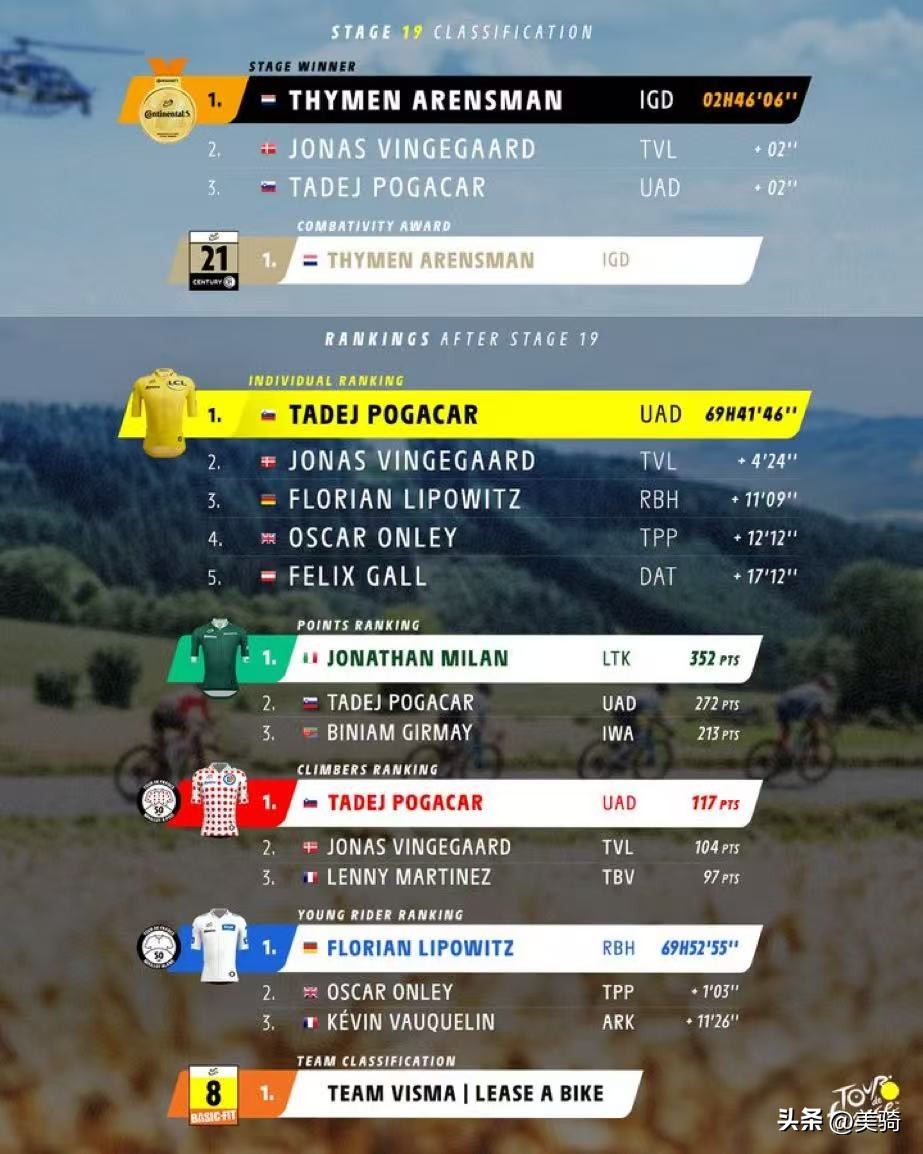 而后方,波加查、温格高、利波维茨等人进行缠斗,并在最后进行了加速,不过由于进攻太晚,最终阿伦斯曼是领先了波温集团10s左右过线,拿下了本届环法他个人的第二个赛段冠军。
