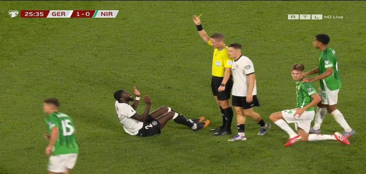 此役主场对阵北爱尔兰,吕迪格在上半场第26分钟因犯规领到一张黄牌。