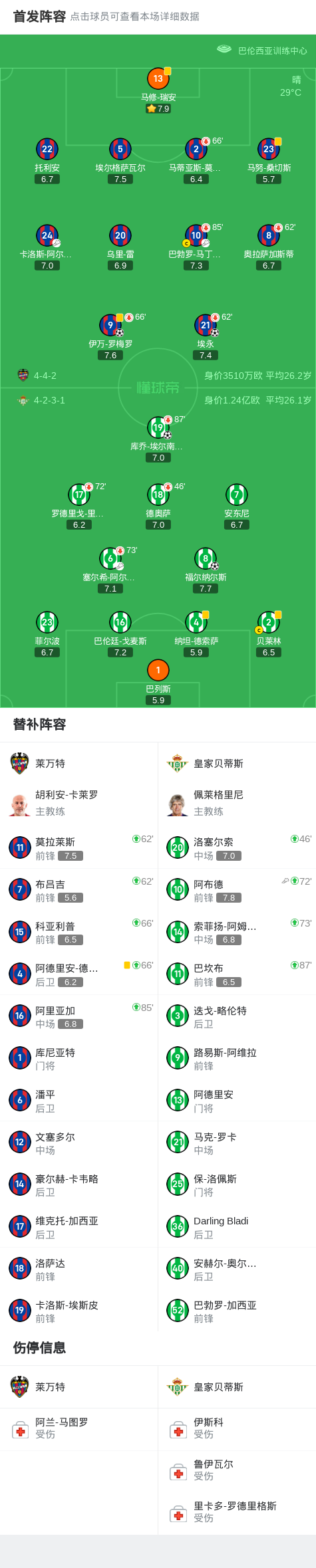 北京时间9月14日,西班牙足球甲级联赛第4轮,莱万特坐镇主场迎战皇家贝蒂斯。比赛开始后,莱万特率先打破僵局,由卡洛斯-阿尔瓦雷斯送出助攻,伊万-罗梅罗完成破门。随后,莱万特再下一城,巴勃罗-马丁内斯助攻埃永将比分扩大。上半场补时阶段,皇家贝蒂斯由塞尔希-阿尔蒂米拉助攻库乔-埃尔南德斯扳回一球。比赛尾声阶段,皇家贝蒂斯球员阿布德送出助攻,福尔纳尔斯破门得分,将比分最终定格为2-2。双方战平结束本场比赛。