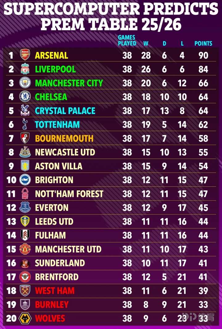 英超第6轮战罢,超级计算机根据各支球队的积分和表现情况,以及球队的阵容,预测了本赛季英超的最终排名。阿森纳将以90分夺得英超冠军,利物浦84分第二,曼城、切尔西进入前四,曼联仅排名英超第15。
