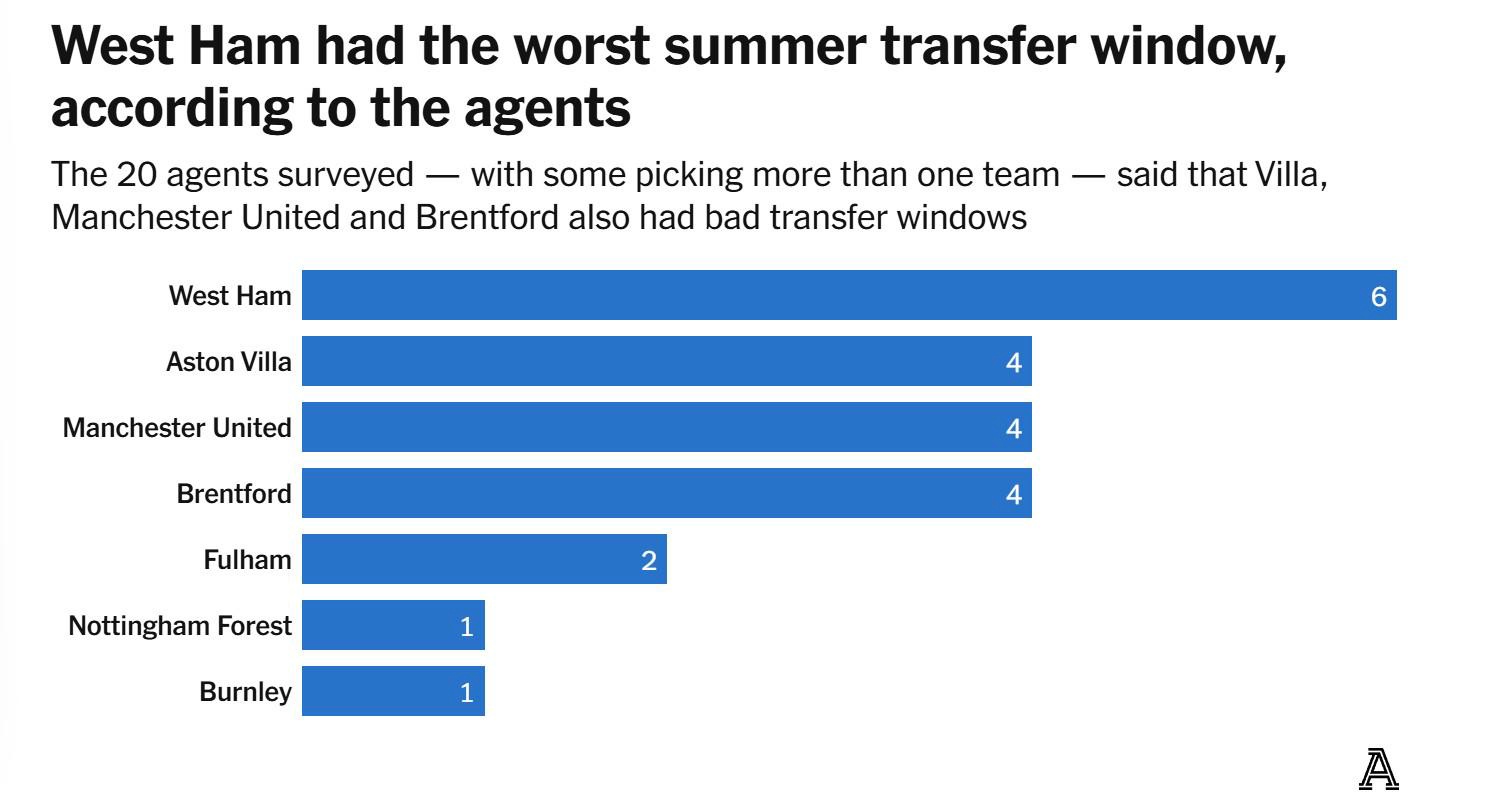 总共有八家俱乐部被点名,曼联、阿斯顿维拉和布伦特福德各获得四票。