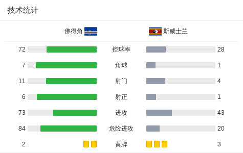 第48分钟,戴龙-利夫拉门托门前破门,佛得角1-0斯威士兰
