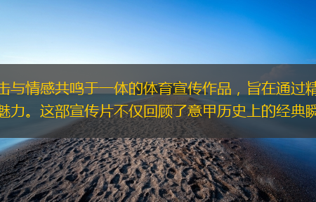 央视意甲宣传片是一部集视觉、听觉、情感于一体的体育宣传作品,通过精美的画面、动人的音乐和丰富的内容,向观众展示了意甲的独特魅力和文化底蕴。这部宣传片不仅让观众感受到了意甲比赛的激情与紧张,也让观众了解了意甲的历史、文化和精神。通过这部宣传片,观众不仅能够重温意甲的经典瞬间,也能够展望意甲的未来发展。央视意甲宣传片是一部值得反复观看和品味的作品,它不仅是一部体育宣传片,更是一部充满情感和文化的艺术作品。