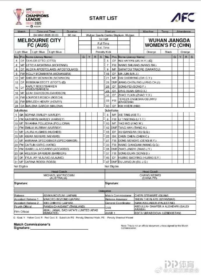 北京时间20点,女足亚冠决赛在武汉体育中心体育场进行,武汉车谷江大女足vs墨尔本城女足,赛前双方首发公布!