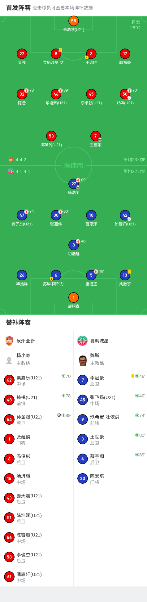 北京时间6月21日,中国足球乙级联赛预赛阶段第15轮,泉州亚新主场迎战昆明城星。比赛中,昆明城星由杨浩宇率先打破僵局,泉州亚新随后由王嘉竣扳平比分。补时阶段,孙金煜为泉州亚新打入制胜一球。最终,泉州亚新以2-1战胜昆明城星。