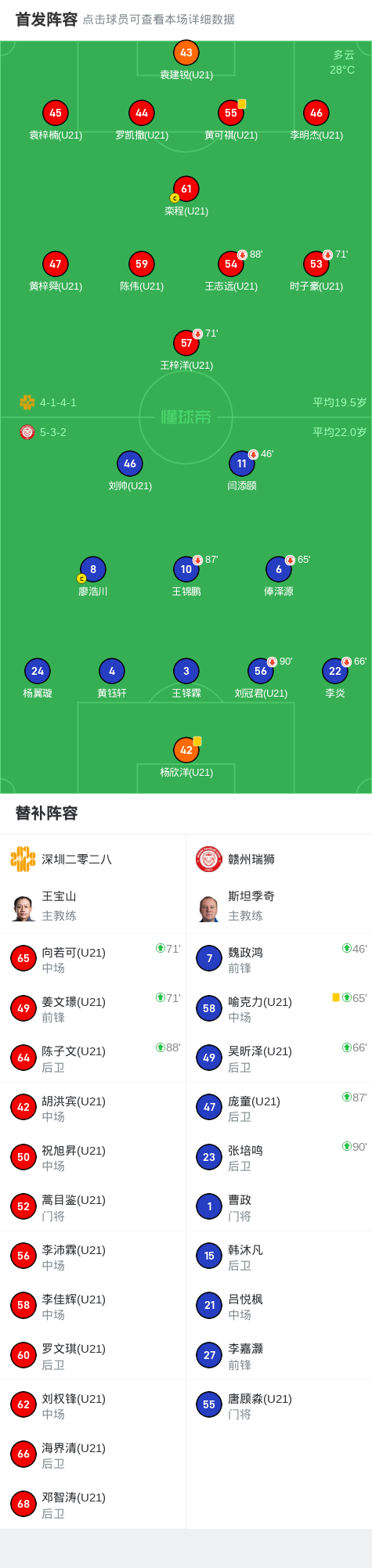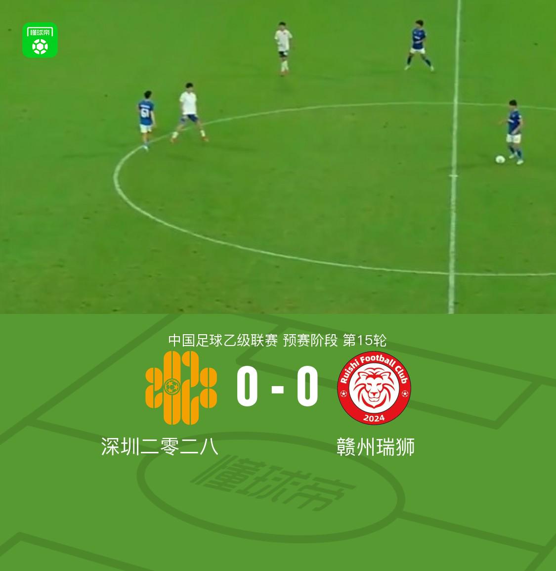 乙级联赛预赛阶段第15轮,深圳二零二八主场迎战赣州瑞狮。全场比赛双方均未能取得进球,最终以0-0的比分握手言和。