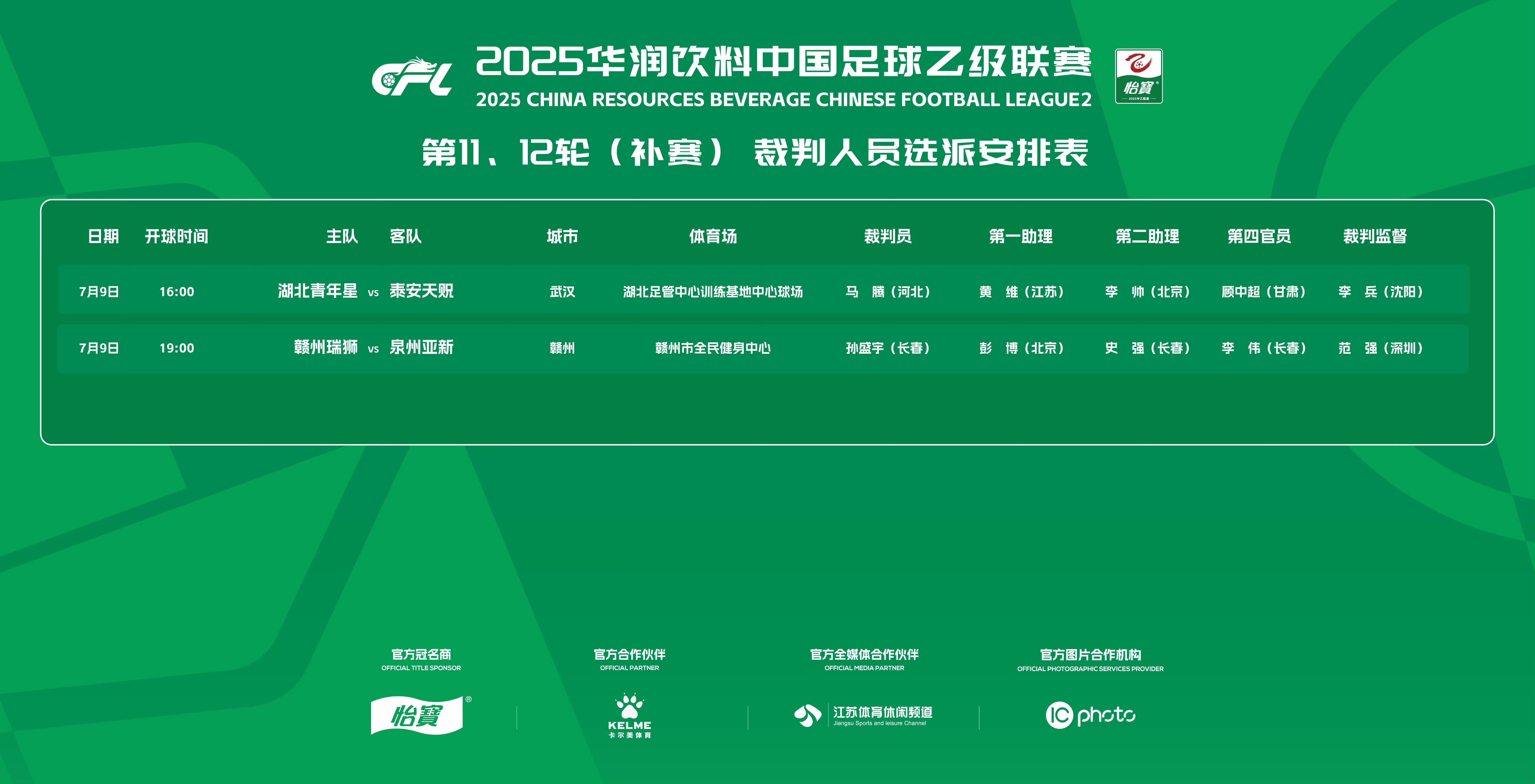 北京时间7月9日,中乙第11、12轮补赛裁判名单公布,马腾执法湖北青年星vs泰安天贶,孙盛宇吹赣州瑞狮vs泉州亚新。