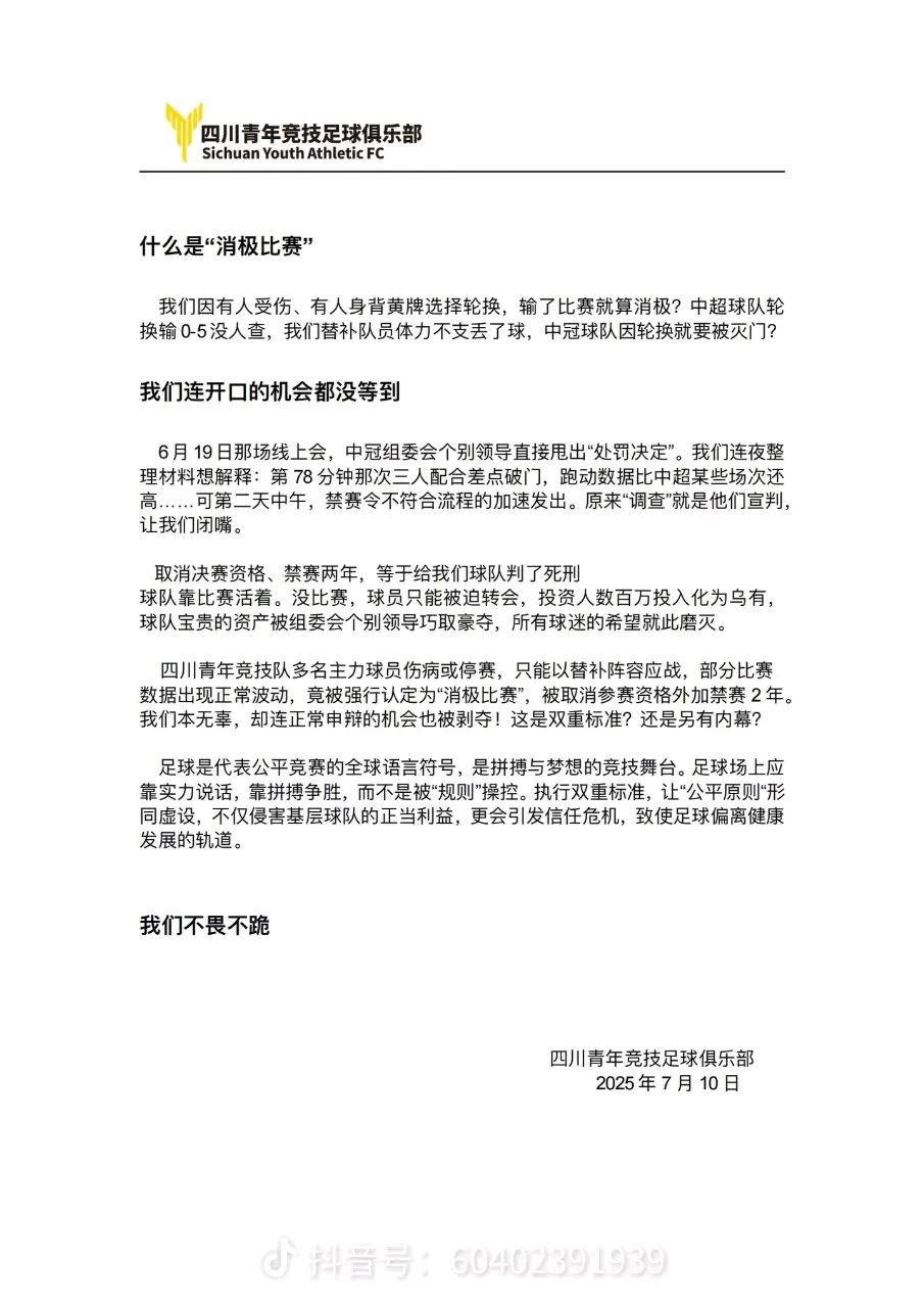 7月10日晚,被中国足协处以禁赛两年的中冠球队四川青年竞技再次发声,继续强调受到了不公正待遇。
