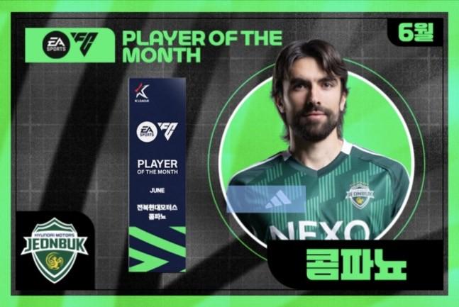 北京时间7月15日,官方消息,全北现代外援孔帕尼奥当选K1联赛6月最佳球员。
