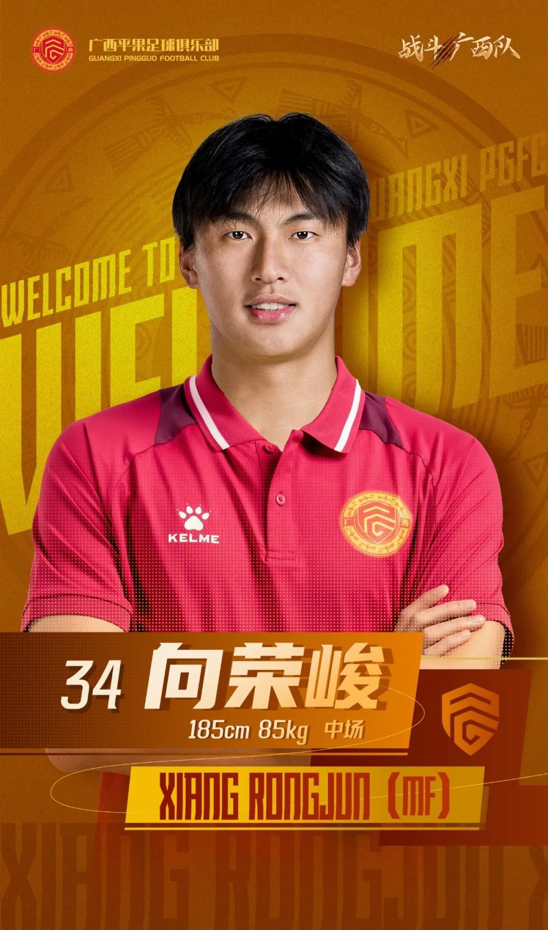 经与上海海港、青岛西海岸足球俱乐部及球员本人友好协商一致,即日起,向荣峻租借加盟广西平果足球俱乐部,将身披34号球衣代表广西平果国晶征战中甲联赛及各项赛事!