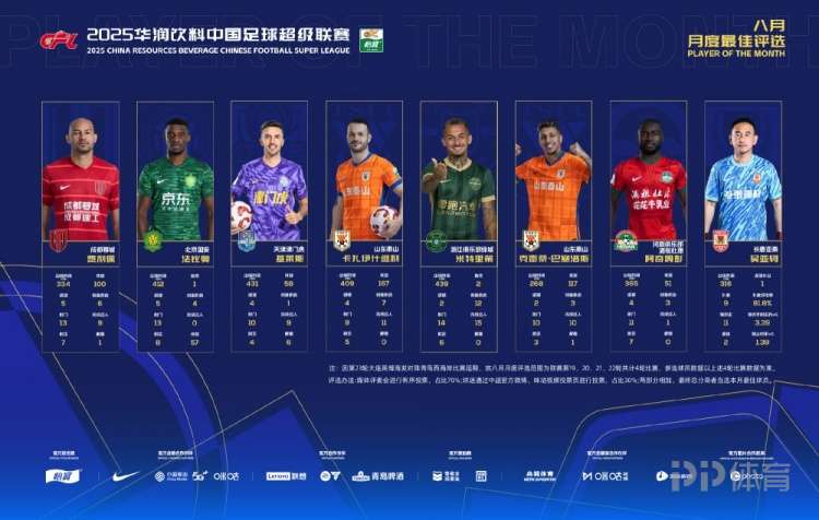 注:因第23轮大连英博海发对阵青岛西海岸比赛延期,故八月月度评选范围为联赛第19、20、21、22轮共计4轮比赛,参选球员数据以上述4轮比赛数据为准。
