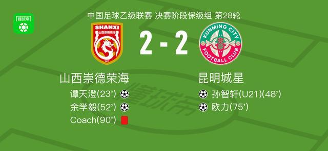 北京时间10月4日中国足球乙级联赛 决赛阶段保级组 第28轮,山西崇德荣海主场对阵昆明城星。山西崇德荣海谭天澄破门,余学毅破门。昆明城星孙智轩破门,欧力破门。最终比分山西崇德荣海 2-2 昆明城星。